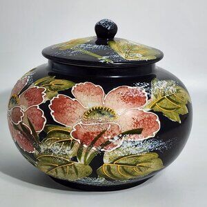 Hand-Painted Black Ceramic Jar Lid Pink & Green Floral Motif Fredrick Cooper