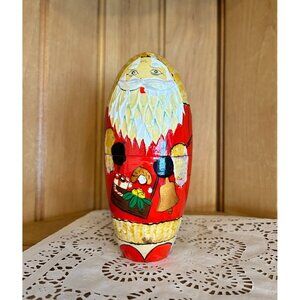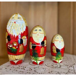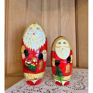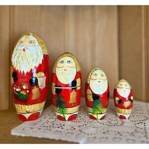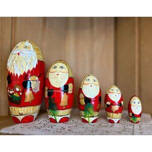 This exquisite set of five hand-painted Russian nesting dolls features Santa Claus in festive attire. Ideal for holiday decor or collectible enthusiasts.