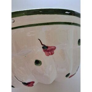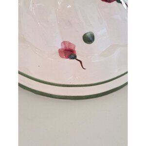 This Italian ceramic bundt mold exemplifies craftsmanship with its hand-painted floral and polka dot motifs. Functional as a mold or decorative wall piece, it features a durable rope for hanging.