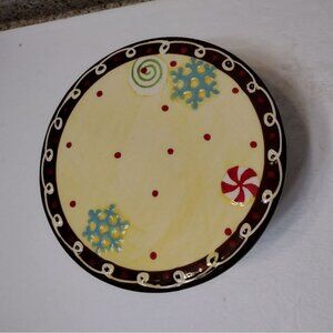 This hand-painted ceramic cake stand features a festive design with red, green, and blue accents. Ideal for displaying cakes and desserts.