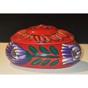 This intricately hand-painted redware pottery trinket box features a vibrant sunflower design on the lid and colorful floral patterns on the sides. Ideal for storing small treasures or decorative purposes, its oval shape offers both aesthetic appeal and practical functionality for home decor. Excellent condition.