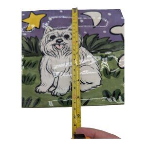 This charming ceramic plate features a delightful Westie dog illustration, complete with whimsical bone accents and a serene night sky backdrop. Hand-painted and signed by the artist, it brings a touch of canine joy and artistic flair to any space. Ideal for dog lovers and art enthusiasts alike.