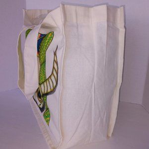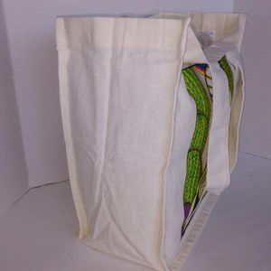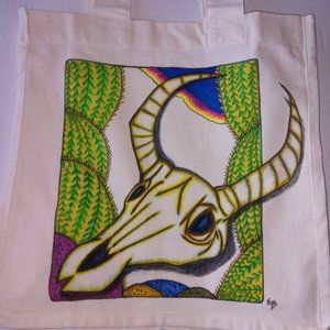 Looking for a new eco-friendly bag or a pretty art piece? This cotton canvas tote bag offers the best of both worlds! This hand painted reusable bag features a cow skull amongst rocks and cactus in the Sonoran Desert. Colors used on this bag include orange , yellow, green, raspberry, purple, blue, turquoise , brown, black, red, grey, and pink. Bag was hand painted and has been heat set. Bag measures 14x13x7 inches. Handles are 1.75 inches wide with 9 inch drop.**HAND WASH COLD WATER. HANG TO DRY*****Items inside bag are for display purposes only and are not included in the sale. Bag has small pin holes at top and bottom due to manufacture packaging.*ALL ITEMS FROM PET FRIENDLY/SMOKE FREE ENVIRONMENT. Items will be shipped in recycled/repurposed packaging whenever possible.