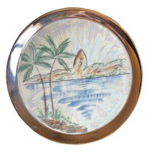 The plate features a serene hand-painted landscape of Rio with palm trees against a tranquil water body and mountain backdrop.