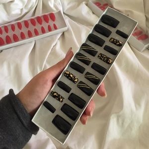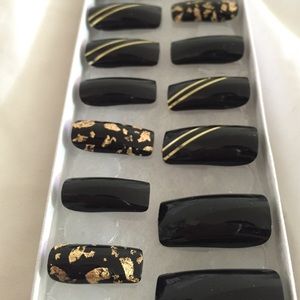 The perfect color combo. Elegant and sophisticated black nails accented with gold trimming and gold flakes. 20pc set comes with 10 different sizes nails. Perfect for a last minute party or date.