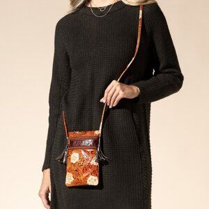Hand-Painted Genuine Leather Cellphone Crossbody Bag with embossed floral pattern and elegant tassel accents.
