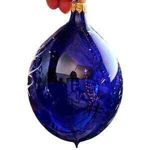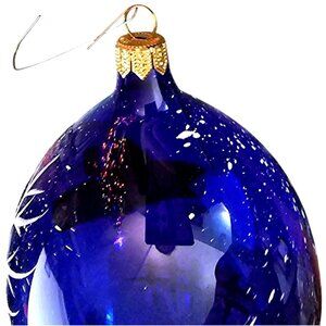 This exquisite ornament showcases a hand-painted snowy cabin scene on rich blue glass, offering an elegant touch to holiday decorations.