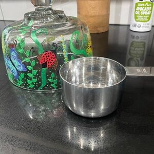 This adorable hand-painted small glass cloche features butterflies, ladybugs, and a dragon fly with flowers, perfect for adding a touch of whimsy to your home decor. This small cloche would be cute over cheese plate, cookies, or a cupcake. Great condition!