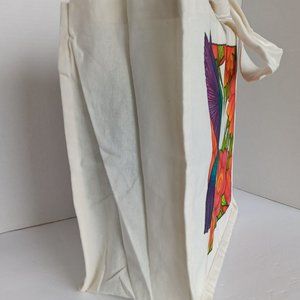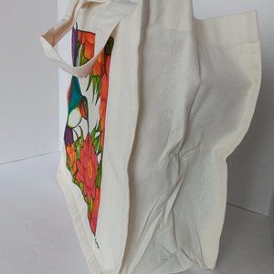 Looking for a pretty eco friendly hand painted reusable tote bag consider this lovely sustainable hummingbird bag. Hummingbirds are considered by many to be symbols of joyfulness, healing, love, and good luck. This hand painted cotton canvas bag features a sweet little hummingbird flitting about the flower garden. Colors used on this bag include orange , yellow, green, turquoise, raspberry, purple, blue, brown, black, red, grey, and pink. Bag was hand painted and has been heat set. Bag measures 14x13x7 inches. Handles are 1.75 inches wide with 9 inch drop.**HAND WASH COLD WATER. HANG TO DRY*****Items inside bag are for display purposes only and are not included in the sale. Bag has small pin holes at top and bottom due to manufacture packaging.*ALL ITEMS FROM PET FRIENDLY/SMOKE FREE ENVIRONMENT.* Items will be shipped in recycled/repurposed packaging whenever possible.