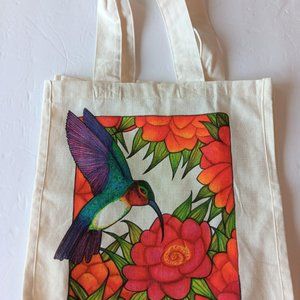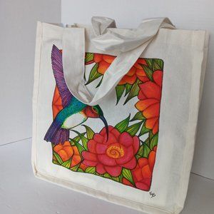 Hand-Painted Hummingbird Canvas Tote Bag: Floral Design (14x13x7 Inch)