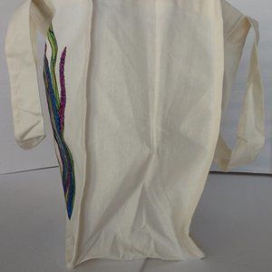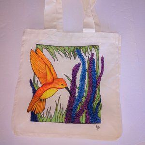 Looking for a pretty eco friendly handmade reusable tote bag? Please consider this lovely sustainable and eco friendly bag. Hummingbirds are considered by many to be symbols of joyfulness, healing, love, and good luck. This hand painted cotton canvas bag features a sweet little hummingbird flitting about the flower garden. Colors used on this bag include orange , yellow , green , turquoise , raspberry , purple , blue , brown , black , red , grey , and pink. Bag was hand painted and has been heat set. Bag measures 14x13x7 inches. Handles are 1.75 inches wide with 9 inch drop.**HAND WASH COLD WATER. HANG TO DRY*****Items inside bag are for display purposes only and are not included in the sale. Bag has small pin holes at top and bottom due to manufacture packaging.*ALL ITEMS FROM PET FRIENDLY/SMOKE FREE ENVIRONMENT. Items will be shipped in recycled/repurposed packaging whenever possible.