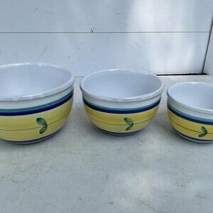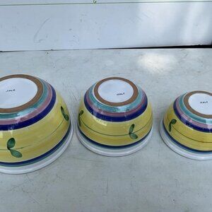 Brighten up your kitchen with this set of 3 Italian nesting bowls, hand-painted with sunny yellow stripes, green leaf accents, and colorful rim detailing. 🇮🇹
