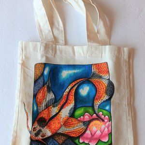Hand-Painted Koi Fish Canvas Tote Bag: Lotus Pond Reusable Bag 14x13x7 inches