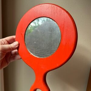 Cute little 70s wooden hand mirror. Hand painted floral theme on bright orange paint. In excellent condition for its age. 6.75x10”