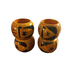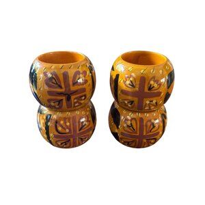 Elevate your dining experience with these hand-painted napkin rings. Their vibrant golden yellow and black design adds a touch of elegance to any table setting. Not sure if they are wood or plastic, feel more like plastic. They are in great condition.