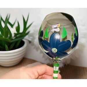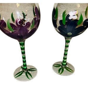 Add a touch of elegance to your wine experience with this stunning two-piece wine glass set from the Artisan Collection. The glasses are beautifully hand-painted with a beautiful purple flower and butterfly design that will catch the eye of anyone who sees them. The glasses do feature a different shade of purple on each. The curved inward design and round shape make them comfortable to hold, and the multicolor glasses are perfect for any occasion.