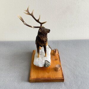 Hand-Painted Resin Deer Figurine 11" Antler Detail, Stone Accent, Wooden Base