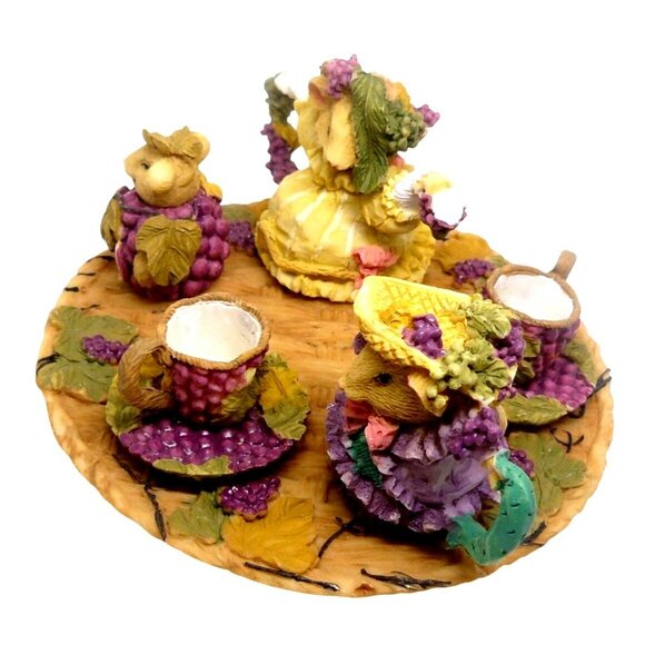 This vintage, decorative set showcases charming mice figures in a tea party scene, crafted with intricate grape-themed details, making it a delightful collectible piece.
