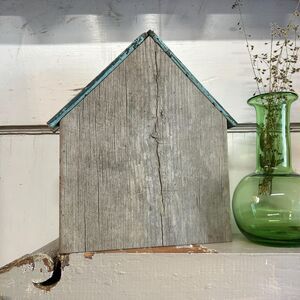 This one-of-a-kind, hand-painted wooden house is the perfect addition to your rustic or cottage-style home. I crafted this piece myself, Jane Leblanc, using reclaimed wood and a beautiful vintage rose transfer. The soft pink roses pop against a lightly distressed white background, bringing a touch of nature and timeless elegance indoors.