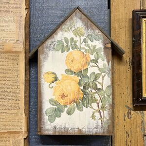 This one-of-a-kind, hand-painted wooden house wall hanging is the perfect addition to your rustic or cottage-style home. I crafted this piece myself, Jane Leblanc, using reclaimed wood and a beautiful vintage rose transfer. The soft yellow roses pop against a lightly distressed white background, bringing a touch of nature and timeless elegance indoors.