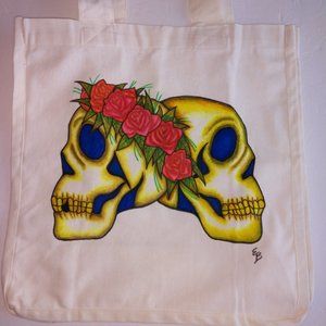 Hand-Painted Skull Tote Bag: Floral Rose Skulls, Reusable Canvas