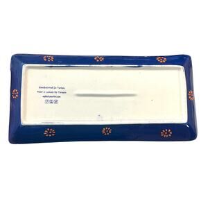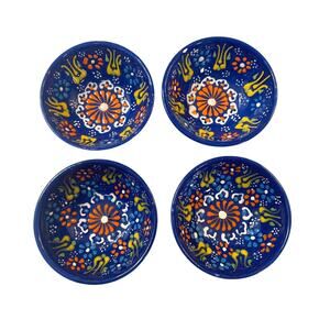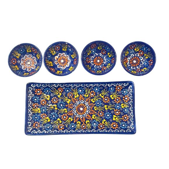 Stunning hand-painted ceramic appetizer set crafted by Aydın El Sanatları in Turkey. Deep cobalt blue glaze with raised floral detailing in orange, yellow, turquoise, and white. Each piece is uniquely finished by hand using traditional Turkish folk-art techniques.