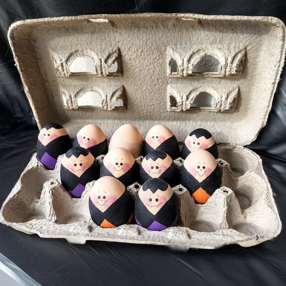 Imagine opening a carton of eggs and finding a cute vampire family staring back at you—tiny fanged smiles, little bow ties, and classic black-and-purple capes. It’s creepy, but in the most lovable way possible! 😄
