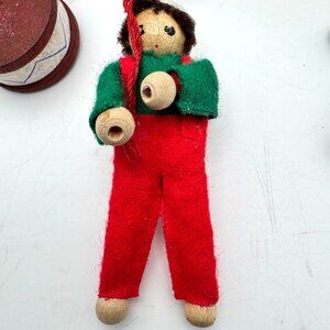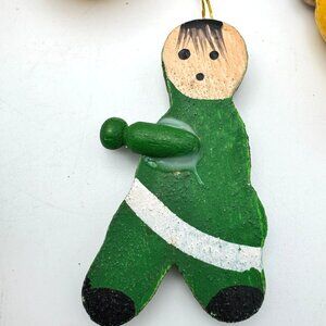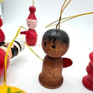 This collection of 15 vintage ornaments includes hand-painted wooden figurines depicting festive figures such as snowman, santa children etc.