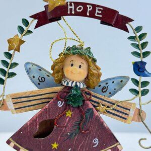 Hand-Painted Wooden Angel Ornament With "Hope" Banner Metal Wings Leaf Accents