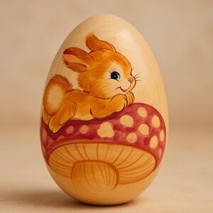 Charming hand-painted egg featuring a cute bunny on a mushroom. Perfect for adding a whimsical touch to your decor.