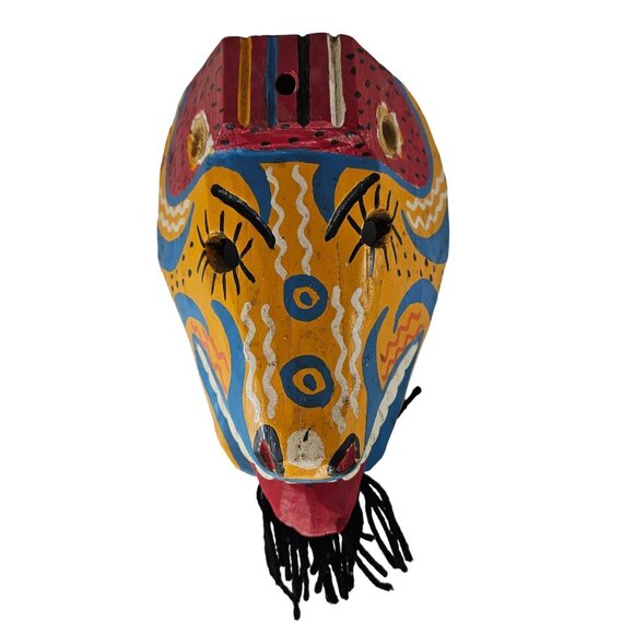 This vibrant mask features a hand-painted design with tribal motifs and a string mane, enhancing its cultural allure and artistic craftsmanship.