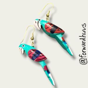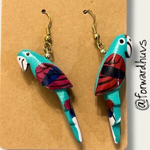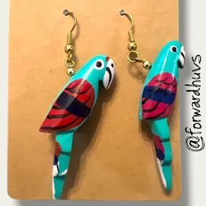 Add a splash of tropical flair with these hand-painted wooden parrot earrings, featuring vibrant detailing in turquoise, red, white, and blue. Each parrot is carefully crafted and painted to showcase expressive wings, long tails, and whimsical personality.