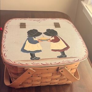 Charming woven pie picnic basket featuring a hand-painted folk art design. The lid showcases two girls in bonnets holding a steaming pie. Lid flips
