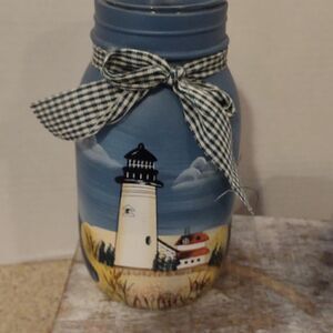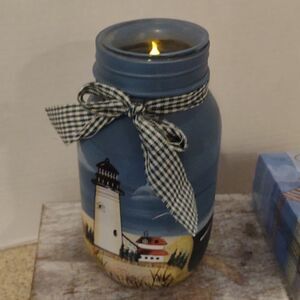 Pretty painted lighthouse scene on bell Jar with opening for tea light candles ( not included). And designer napkin pack with beach scene - looks too pretty to use.