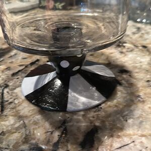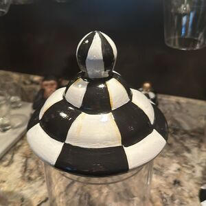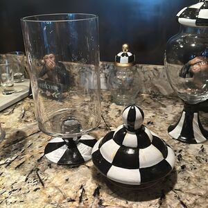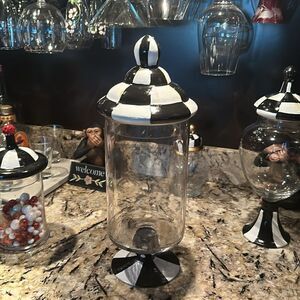 This glass jar is heavy weight, measures 19” tall. The base and the lid have been painted in a whimsical designer inspired, checks, stripes, polka dots. This accent piece has a wide variety of versatile uses. I do offer smaller and other designs.