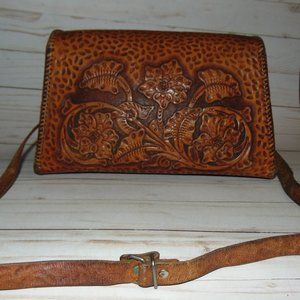 Vintage shoulder bag hand-tooled Leather floral western pattern and matching checkbook cover/billfold. Strap has a snap to adjust length. Hard structured leather not flimsy or soft. No lining but has a finished leather texture. Measures: The bottom base 11x5 inches. The Height is 7.5 inches from bottom to top. In used vintage condition. Some wear light damage on the outer lacing left side top. (photo) Clean inside and out no stains. The strap is softer, the back side of the strap is suede and does show a bit of wear. The checkbook cover/billfold has a floral pattern on one side and an equestrian pattern on the other. It is also hard firm leather, not soft. It measures 7x4 inches closed. In used vintage condition. It has some small ink spots on the inside (photo)