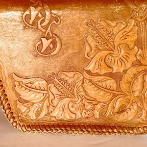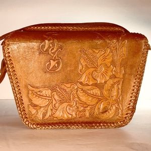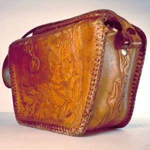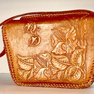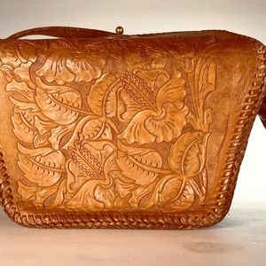 Gorgeous floral carving on this genuine vintage hand-tooled leather handbag.