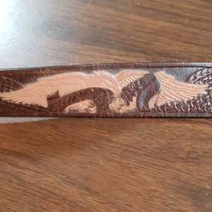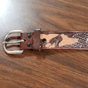 Heres a great vintage belt, hand tooled & dyed. It comes with a regular silvertone belt buckle. 5 eagles with banners/flags in their mouths/beaks.