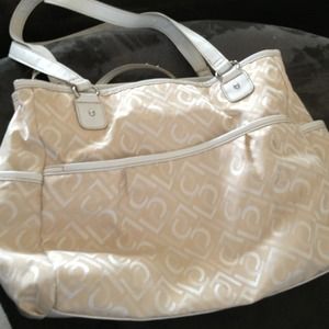 Cream colored bag with matching makeup zipper pouch. Side pockets and pockets in front and back.