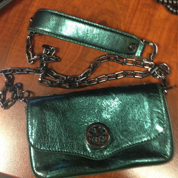 Tory burch metallic green cross body with gunmetal hardware. Used only once and includes dust bag