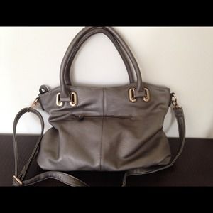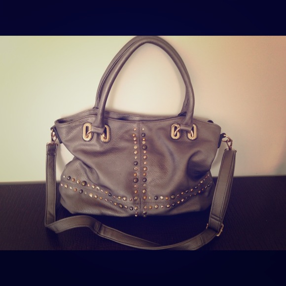 Grey handbag with silver, copper, gold big and small studs at front, removable shoulder strap.