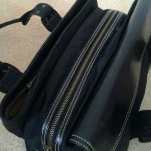 Black fabric handbag with multiple sections. Lightweight. Its an Elise Tran bag (brand born in Hawaii), but no labels in bag.