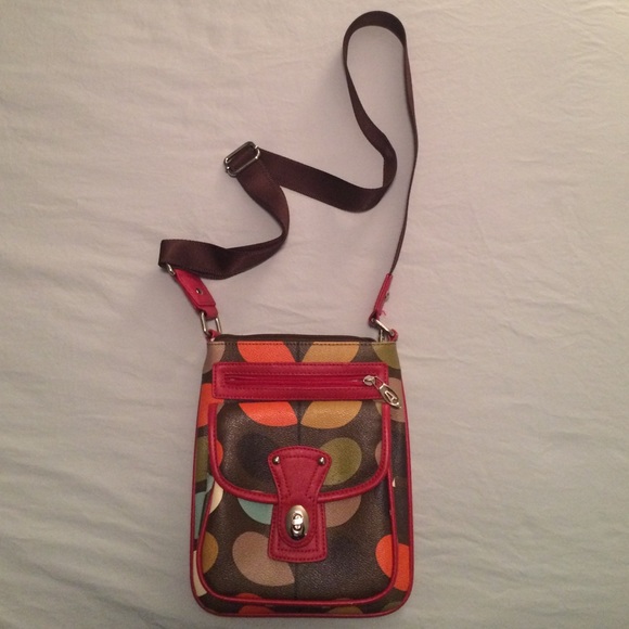 Hand bag. One zipper broken but the rest still work great! Adjustable strap. Made with 5 different pockets