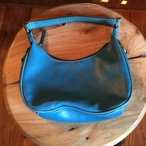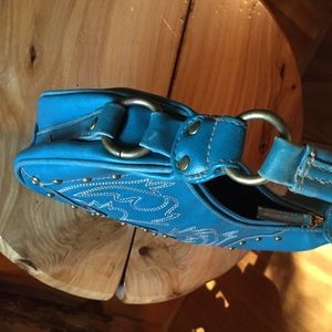 Small teal/turquoise bag with cute round studs. Perfect condition! Has 2 regular pockets and 1 zipper pocket.