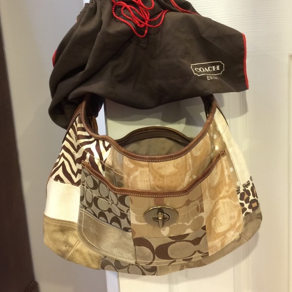 Authentic Coach patchwork , 17 x 10 , suede in corners are soiled . Rest of bag is clean ..