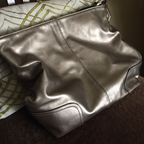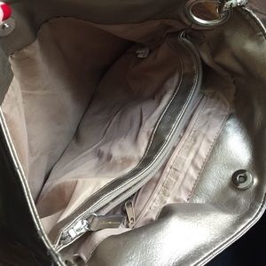 Trendy Medium sized, gold shimmer handbag. 2 large compartments with additional 2 smaller, zip close pockets. Button snap closure.