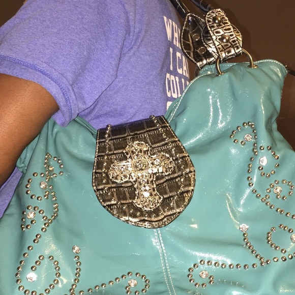 Turquoise Rhinestone Cross bag. A beautiful bag that has a bit of wear from rubbing against my clothes. Looks great paired with jeans or a dress or the rhinestone sandals featured in another listing.