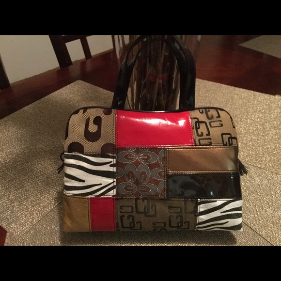 This multi printed handbag made of faux patent and suede with see through zipped pockets. Fun & Stylish!