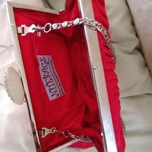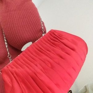 Red evening pleated handbag about 6.5 to 7 inches wide with silver strap and glittery clasp that keeps it closed. Worn once prom night.