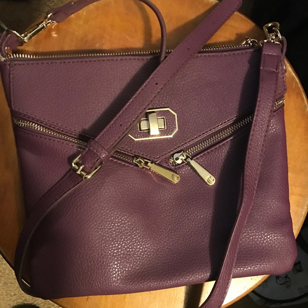 This is a crossbody bag. It has an insider zipper with two pockets on the inside to put your cellphone, cards, coins, chapstick ect. Has some minor pen markings on the inside the outside is in really good condition. Purple with tan on the inside and it also has two zippers on the outside to store things, the outside pockets go very deep. It's a great purse for everyday use.